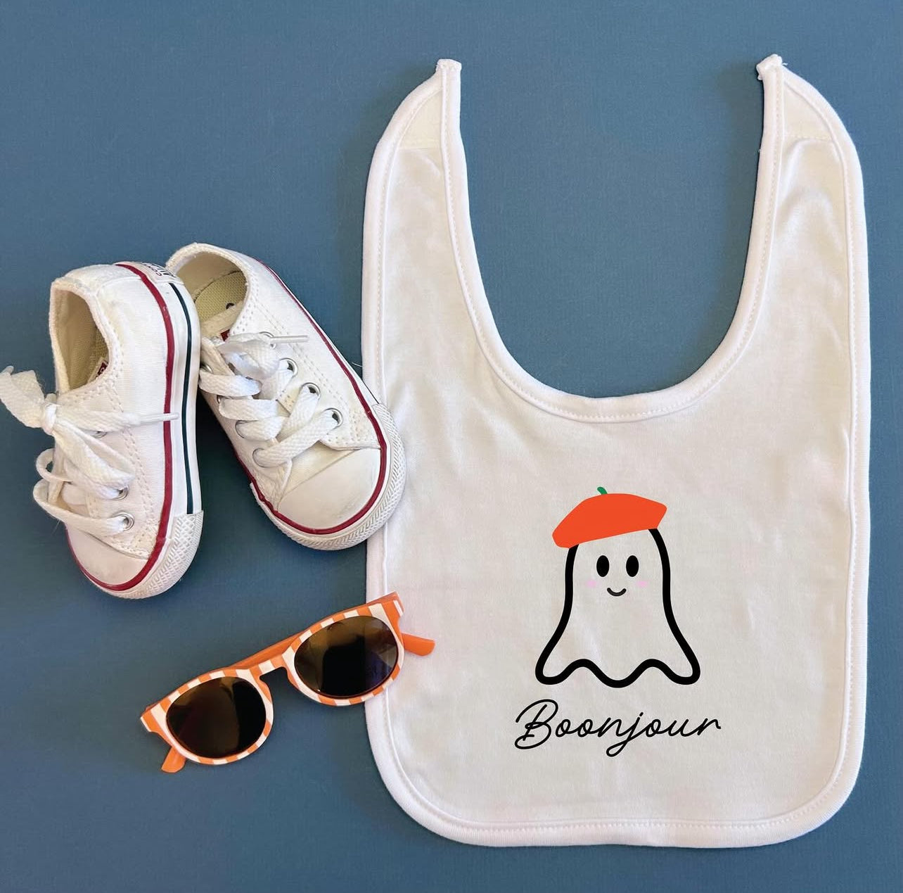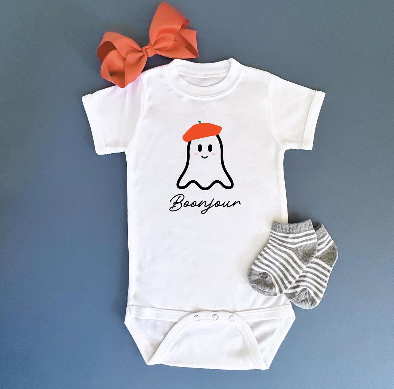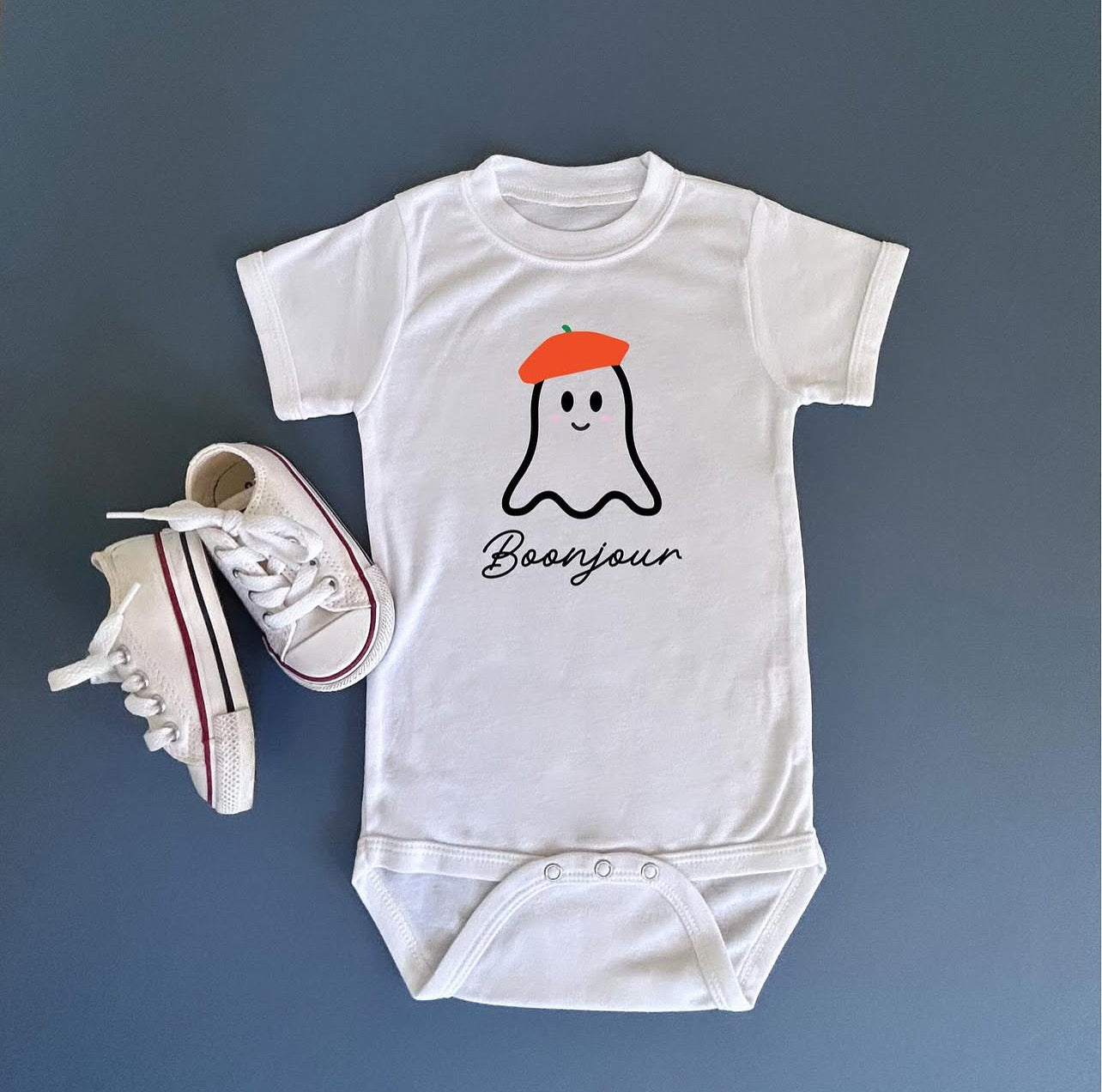 Say “Boonjour!” to the cutest little ghost around. This adorable baby shirt features a friendly French ghost—complete with a beret and a smile—cheerfully greeting the world with its best “Boonjour.”